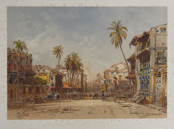 A wide street in Bombay, India, after a watercolour by Eduard Hildebrandt (1818-1869). Born in Gdansk, Hildebrandt travelled constantly, including visits to the Middle East, India, Singapore, Siam (Thailand), Macao, Hong Kong, China, The Philippines, Japan and the United States. He worked mainly in watercolours, and his paintings were exhibited in London in 1866 and at the Crystal Palace in 1868, just a year before his death in Berlin. A folio of chromolithographs, mounted in imitation of watercolour presentation, was published as 'Reise um die Erde', (Journey around the World).