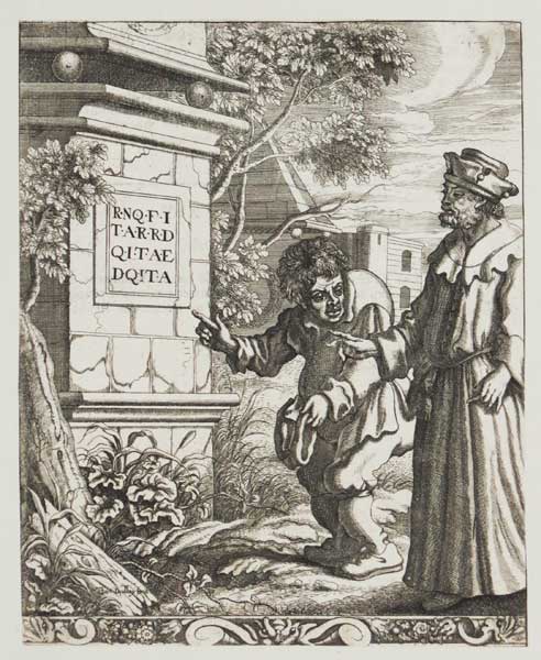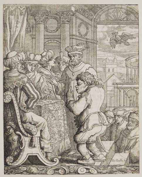 One of thirty-two illustrations to the second (1687) edition of Francis Barlow's Aesop, showing scenes from the life of the Greek storyteller. All of the plates were designed by Barlow but only five were etched by him. The rest, including this one, were etched by Thomas Dudley (1678-9, fl.). Little is known of Dudley- he signed himself as a student of Wenceslaus Hollar in one print and while he etched some portraits, his prints after Barlow are his most important work. In 1679 he went to Lisbon, where he is known to have made further prints, and he is not supposed to have returned to England thereafter.