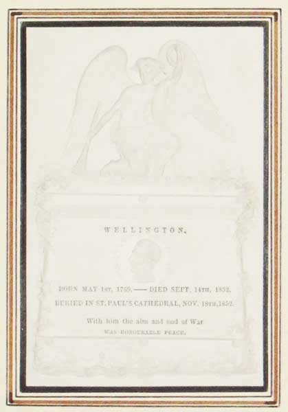 A bust portrait of Arthur Wellesley, 1st Duke of Wellington, (1769-1852), in profile to the right, within a decorative circle, with ornate plaques on either side inscribed with 'Toulouse', 'St. Sebastian', 'Vittoria', 'Salamanca' and others. A small scene depicting the Battle of Waterloo is below the portrait.