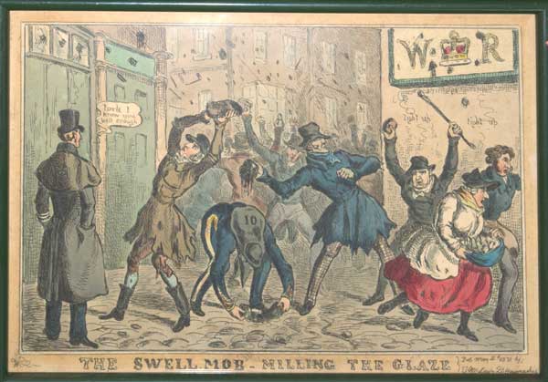 A street scene with ragged Tories smashing windows illuminated for the dissolution of Parliament. From left to right are Peel, Londonderry, Wellington, Eldon, Scarlett (dressed as a woman) and Ellenborough. Wellington aims a handful of mud at the king's cypher on a wall. Lord Grey called a general election hoping for a better majority for his Whig government, leading to demonstrations by the Tories, although the windows of Wellington's home, Apsley House, were also smashed. 'Mill the glaze' was slang for 'break a window'; the 'swell mob' were pickpockets who dressed respectably to blend in. BM Satire: 15701.