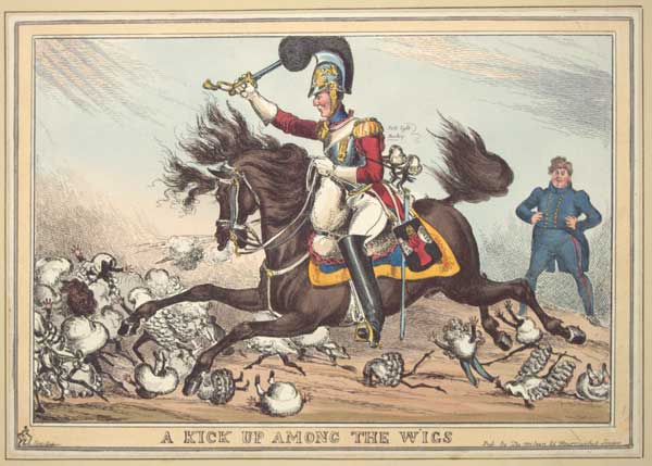 Wellington, dressed as a Life Guards officer, rides a galloping charger over little men made of large wigs with little arms and legs. Behind is George IV, who holds his sides, laughing at the plight of the Whigs. The Tory duke became Prime Minister in January 1828. BM Satires 15505.