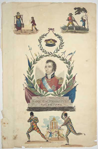 A combination of two prints, with a portrait of th Duke of Wellington in dress uniform. Harlequins dancing at bottom.