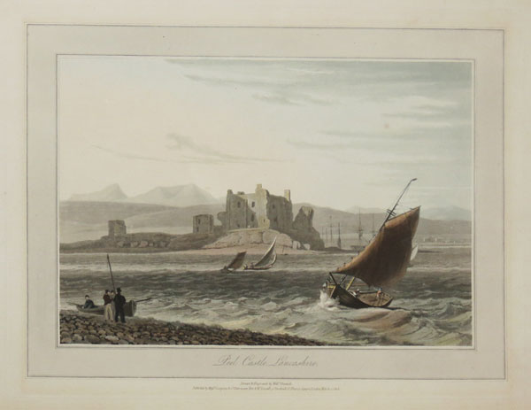 View across the bay to the ruins of Piel Castle, on Piel Island, one of the Islands of Furness. Several boats sail across the foreground whilst a group of figures gather around a rowing boat. Masts and buildings can be seen in the background. Plate 45 from "Voyage Round Great Britain".