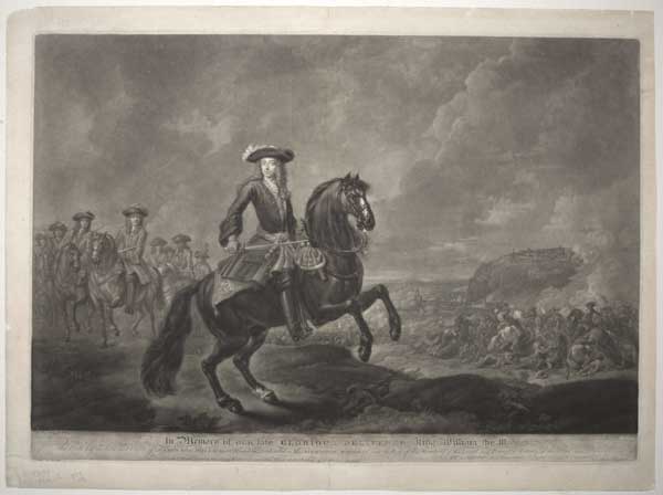 William III on horseback at the battle of Namur (present day Belgium) in 1695 during the Nine Years' War. Engraved after a painting by Dutch artist Jan Wyck (1645–1702) now in the National Gallery of Ireland. CS 387, ii of ii. Ex: Collection of The Hon. C. Lennox-Boyd.