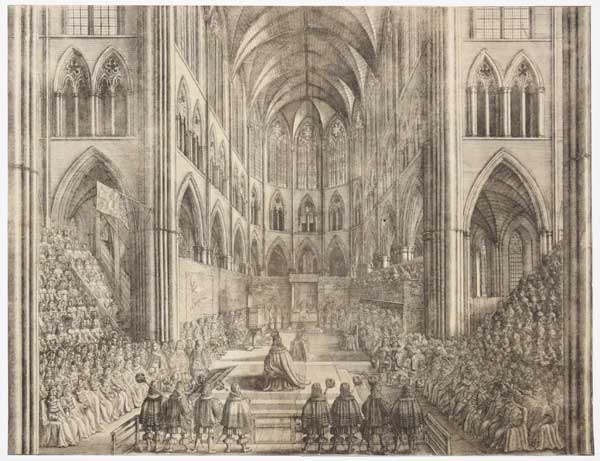 The coronation of Charles II at Westminster Abbey on 23 April 1661. Published in 'The entertainment of His most excellent Majestie Charles II...' (1662) by John Ogilby. Ogilby had obtained exclusive publishing rights for the coronation procession days before it took place, rushing out a simple and unillustrated text in time for the event, and over the next year worked on this sumptuous account with engravings by leading engravers including (as here) Wenceslaus Hollar, (1607-77), Bohemian printmaker who spent most of his career working in England. Hollar's technical skill has ensured that his prints have always been keenly collected, and comprehensive collections of his work are at institutions in London, Berlin and Prague. P 575