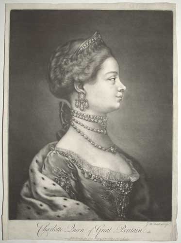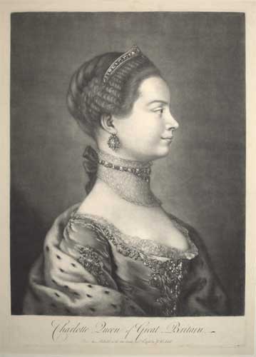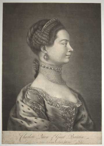 A profile portrait of Queen Charlotte, published as a pair to one of her husband, George III, after Jeremiah Meyer. CS 41, ii of iii. Goodwin 84, iii of iv. Ex: collection of The Hon. Christopher Lennox-Boyd.