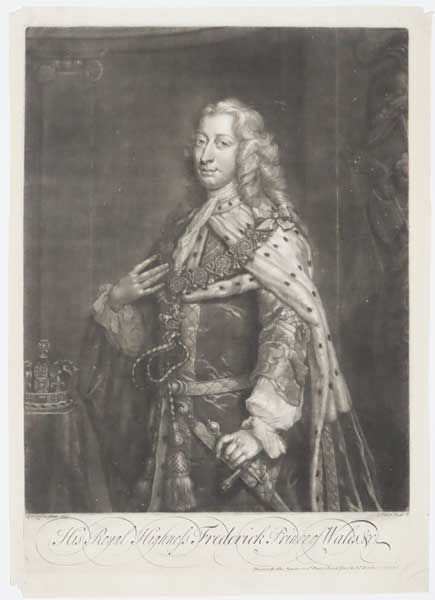 Three-quarter portrait of Frederick (1707-51), heir apparent of George II, standing in robes and ermine cape, wearing a chain of state. CS 144, unlisted state after ii of ii; Russell iv of iv. Ex: collection of The Hon. Christopher Lennox-Boyd.